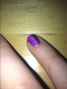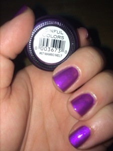 Today’s Mani Monday is brought to you by Sinful Colors polish in the color “Mambo Melt”. It’s a very shiny purple, no shimmer, not metallic but it’s certainly not matte. I guess I’d call this a satin finish.